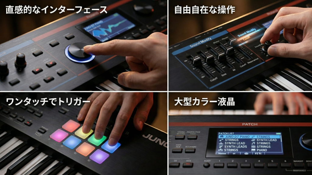 演奏中に湧き上がるアイディアを即座に音へ反映できる、操作性の高さも重要な要因です。メニューの奥深くに入り込まずとも、手元で直感的にサウンドを変化させられるハードウェアの仕組みが整っているからです。