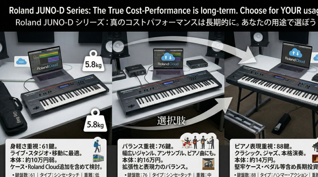 前提として、本記事では初代モデルから最新のD6・D7・D8までの変遷を扱います。購入時には「自分に必要な鍵盤数」を慎重に見極めることが極めて重要となるため、その注意点を先出しして詳しく掘り下げていきます。膨大なRoland JUNO-D 音色 一覧の活用方法から関連情報までを網羅した完全ガイドです。