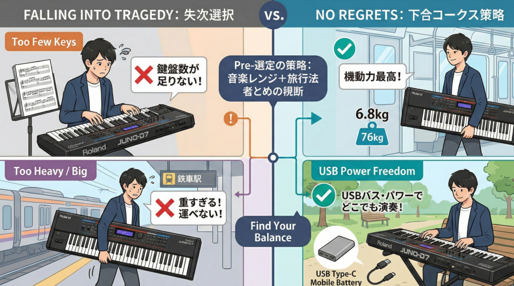 この失敗の根本的な原因は、自分の「プレイスタイル(弾く楽曲の音域)」と「普段の運搬環境(電車か車か)」のミスマッチにあります。この悲劇を回避するための確実な対策として、購入前に「自分が弾く可能性のある最も音域の広い楽曲」と「スタジオ等への具体的な移動手段」を書き出し、重さと鍵盤数の妥協点を冷静に見極めることが絶対条件となります。