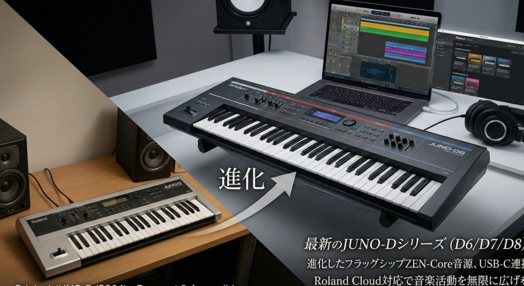 その後、現場の要望に応えた「ROLAND JUNO-D Limited Edition」が登場し、豪華なプリセットが追加されて活躍の幅を広げました。この「高音質かつ軽量」という遺伝子は、その後の派生モデルを経て、現在の最新シリーズ(D6/D7/D8)へと進化しました。フラッグシップのZEN-Core音源やUSB-C連携機能を引っ提げたこの進化は、結果への影響を劇的に高める「完全なる再構築」だと言えます。